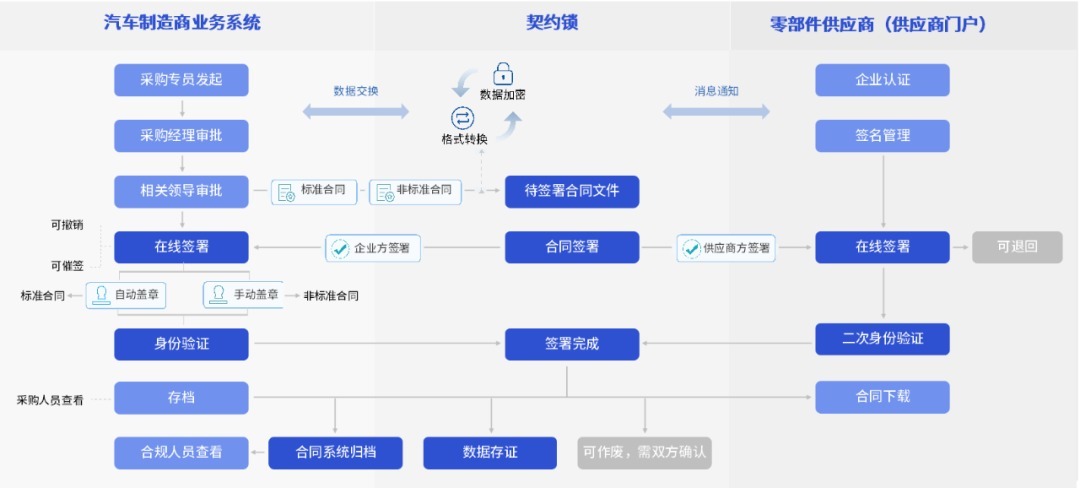 契约锁帮助集成OA、SRM管理软件,在汽车零部件采购业务中实现“供应商身份认证、合同及单据文件预设电子模板、供应商及车企远程签字盖章”,省去打印、快递的麻烦,批量高效处理与全国数百家供应商签署工作。